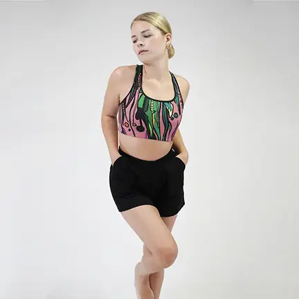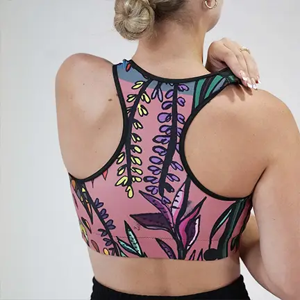 • Cuello redondo y espalda cruzada. Costuras planas y dobladas al bies para minimizar los roces Material de soporte en las hombreras, doble forro delantero y una banda elástica ancha debajo del pecho para soporte extra. Espalda cruzada, los tirantes se cruzan entre sí.